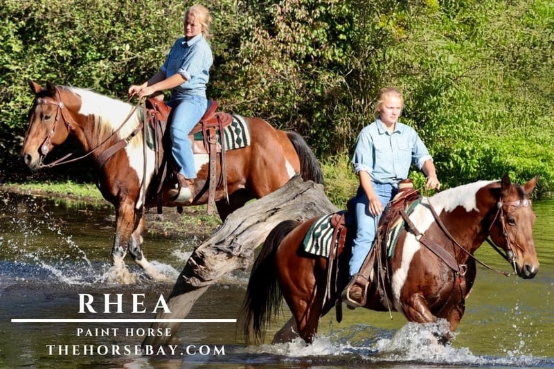Rhea is a 10yr old Paint Mare standing at 15.1 hands tall with a nice stout build. She can easily carry a bigger rider. Rhea is a trail riders dream. She is more whoa than go she has an easy going demeanor. She’s pretty easy to handle and get along with. I would consider her husband or wife safe. You can put someone on that knows how to ride a little and have them follow along on her and she takes care of them. She has smooth gaits too. Her trot is so smooth and easy to sit to that she has fooled more than one person into thinking she was gaited. And she has a nice little rocking chair lope. Rhea has a nice personality as well she’s easy to catch out in the pasture she’s friendly and loves to be around people. When you go out to catch her, she normally will walk right up to you and loves the attention. She is an easy keeper and needs NO maintenance. She stays a good weight on just grass or hay. She is middle to low in the pecking order. She gets along out in a mixed herd. She will ride away from home alone or in a group fine. She is more whoa than go so she prefers to just follow along in the back and stay at her own pace, but she will lead the group as well if you ask her to. She is great out on the trails does NOT easily spook. She’s fine with having a doggy friend follow her along out in the woods and doesn’t mind the wildlife. She will cross bridges, logs, and water. She’s been in creeks, lakes, and rivers. She can handle the big steep hills and banks just fine. She picks her way down a hill very easy and careful. She loads in a trailer and backs out fine. She stands good tied, for tacking, and mounting. She is safe NO bad habits or vices. She is GREAT with traffic. We have ridden her down the dirt roads with big equipment trucks and other regular traffic going by and she never blinks an eye.
